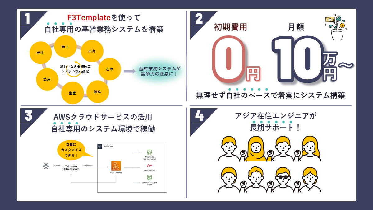 F3Templateをベースにして、貴社のペースに合わせて、システム機能や業務改善をじっくり検討できます。