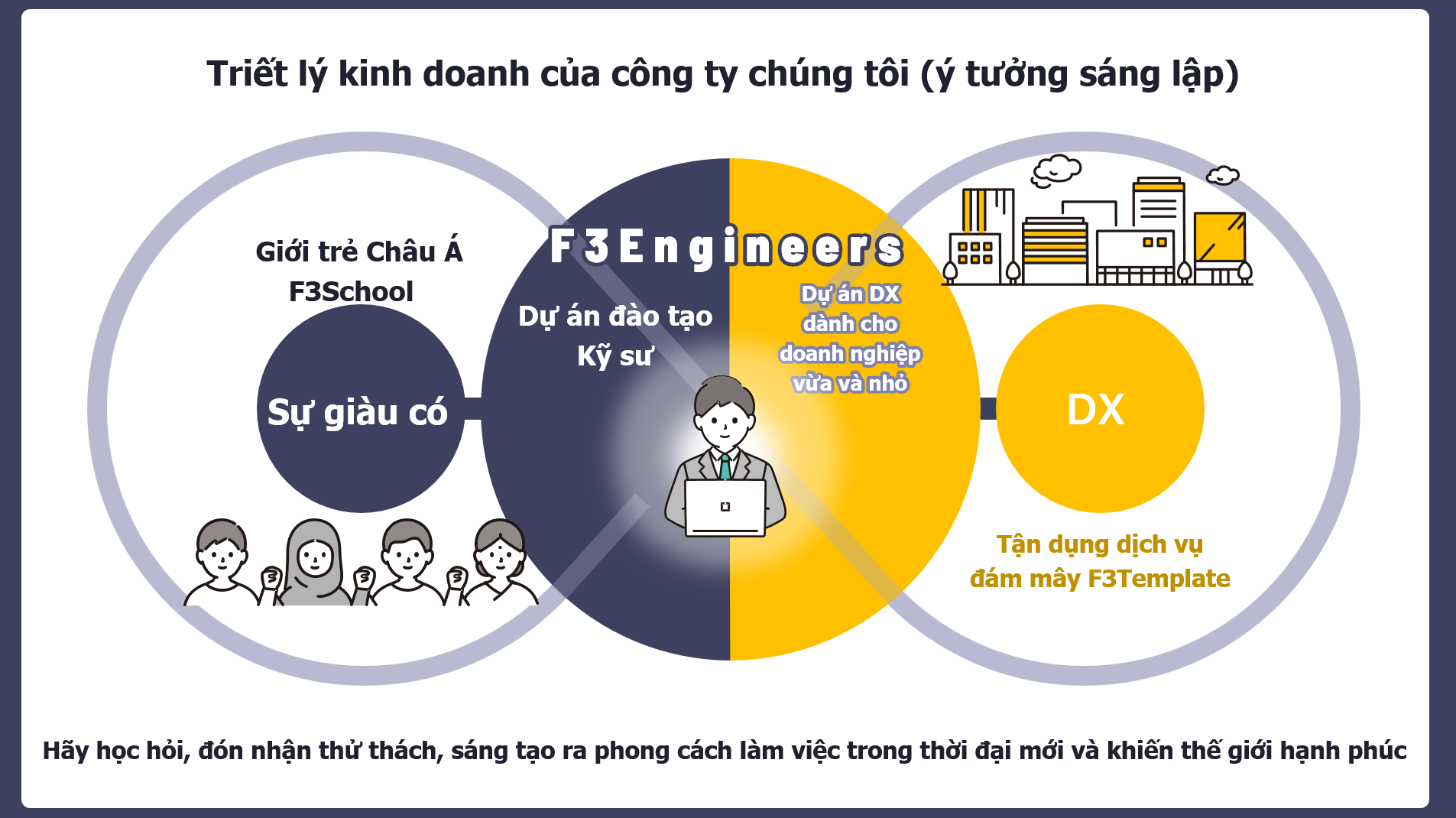 F3Engineers của chúng tôi mong muốn hỗ trợ triển khai và vận hành hệ thống với tư cách là bộ phận hệ thống của khách hàng. Chúng tôi muốn vượt ra ngoài ranh giới các giá trị quan cũ của các công ty, tổ chức và hỗ trợ việc xúc tiến DX của công ty, giống như gia đình và bạn bè của chính mình. Từ đó, tôi tin chắc chắn việc xúc tiến DX thành công sẽ đến.