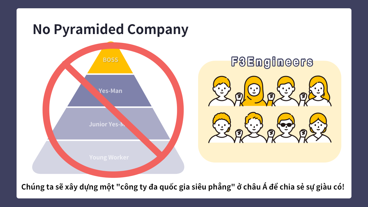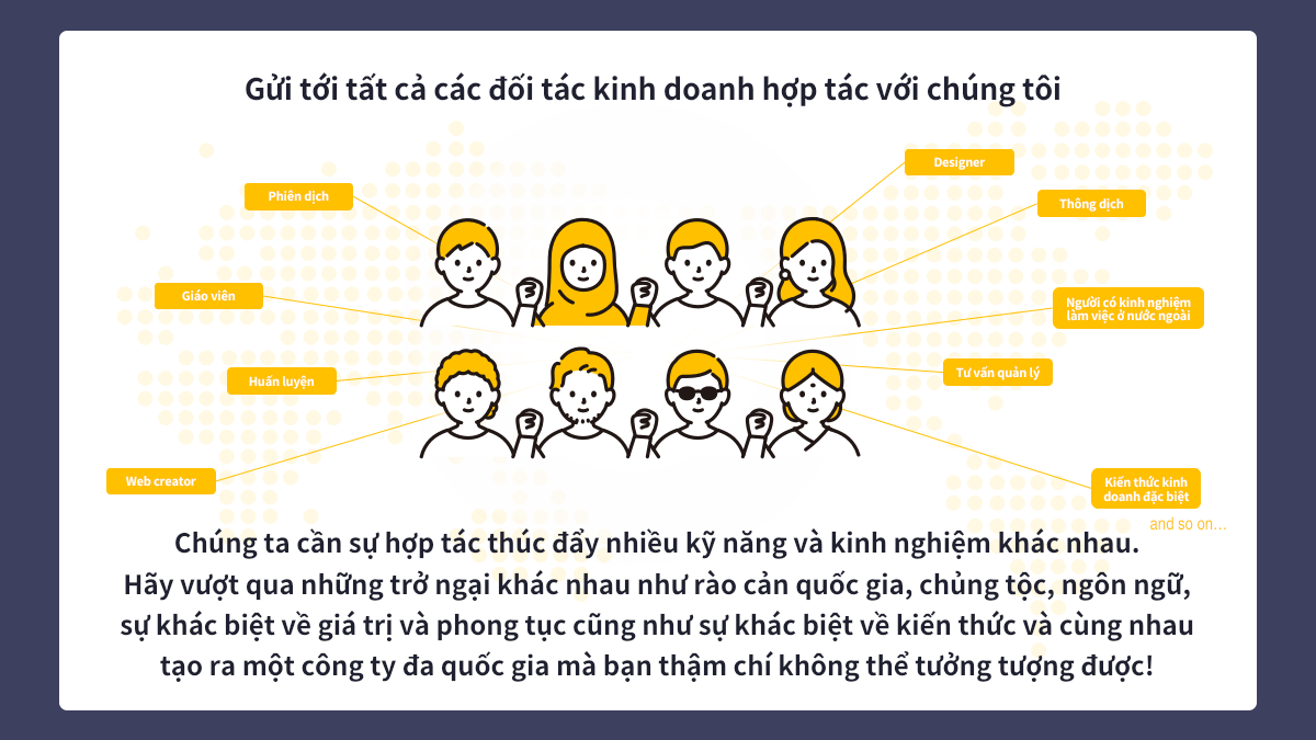 Chúng ta hãy cùng nhau tạo ra một công ty đa quốc gia bằng cách vượt qua các rào cản về quốc gia, chủng tộc, ngôn ngữ, phong tục, giá trị và kiến thức.